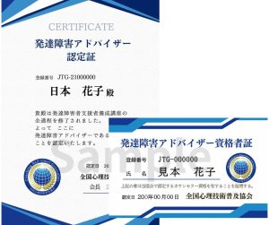 | 認定資格 | 全4回の授業を受講された方に、資格認定証を発行します。 全国心理技術普及協会認定『発達障害アドバイザー』 |