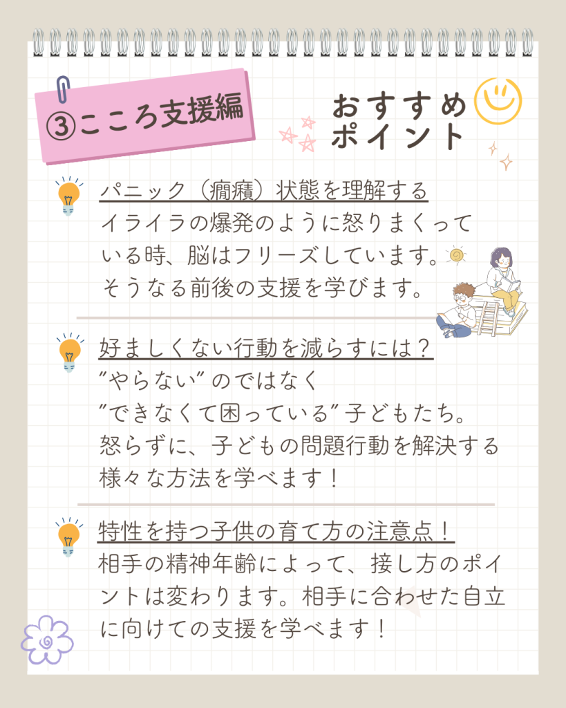 - 「行動の背景」を理解し、感情や特性に寄り添えるようになります