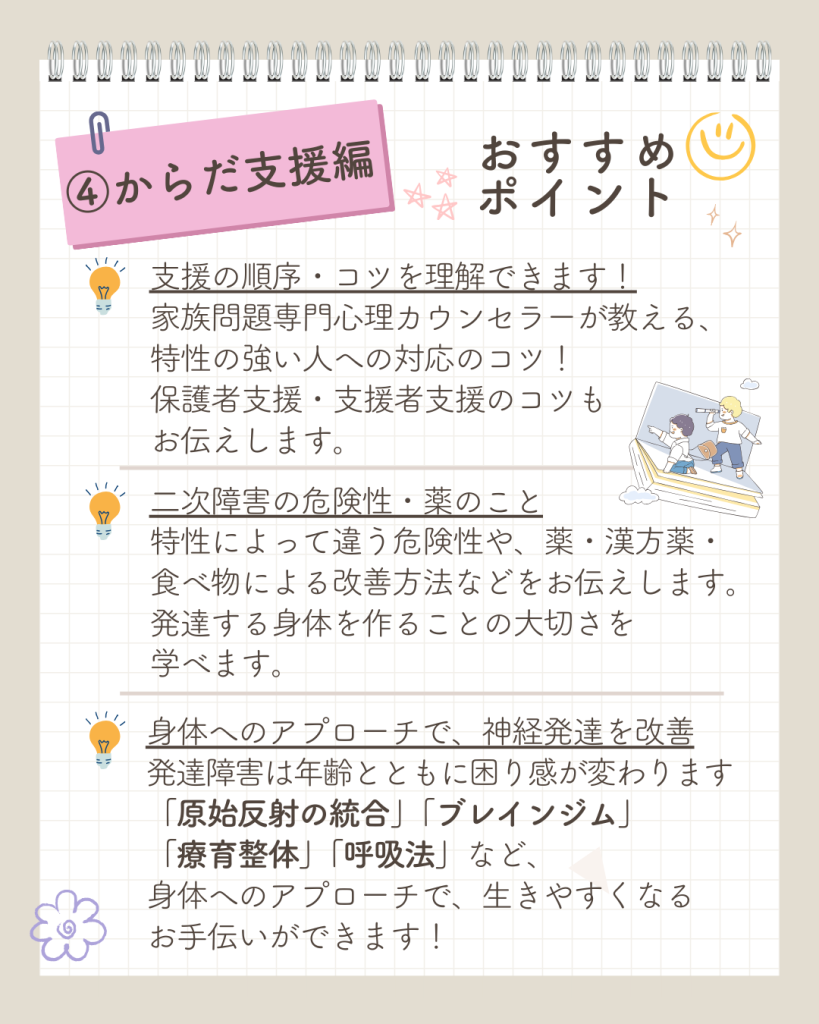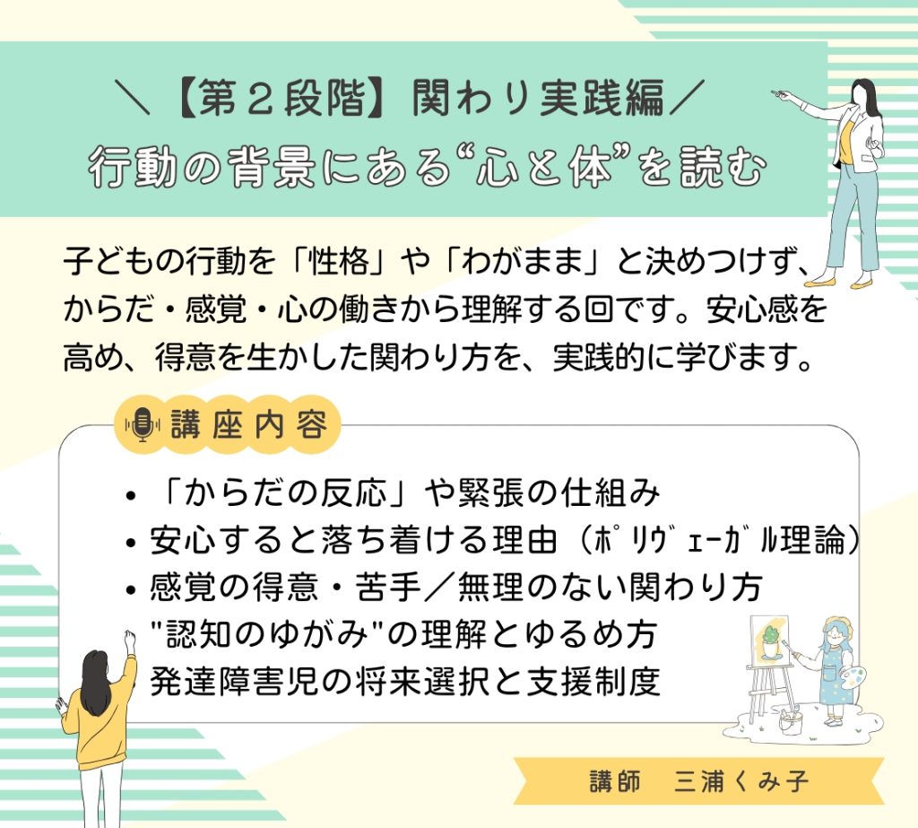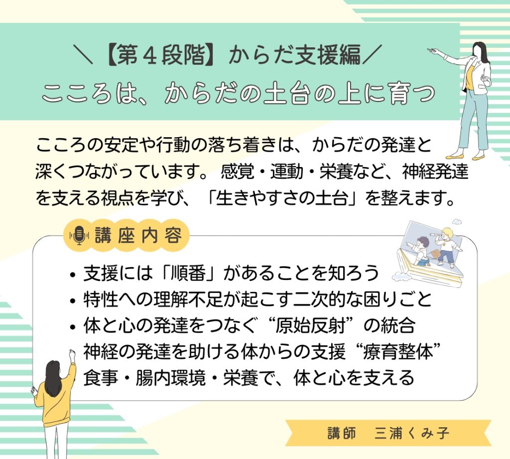 この回では、感覚統合・運動・呼吸・栄養・腸内環境など、身体から神経発達を支える視点を学びます。