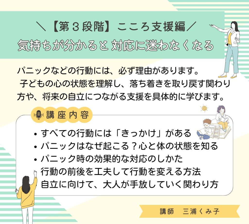 この回では、パニックの仕組みや感情調整の考え方を学びながら、行動の前後にある「原因」と「結果」に働きかける支援を身につけます。