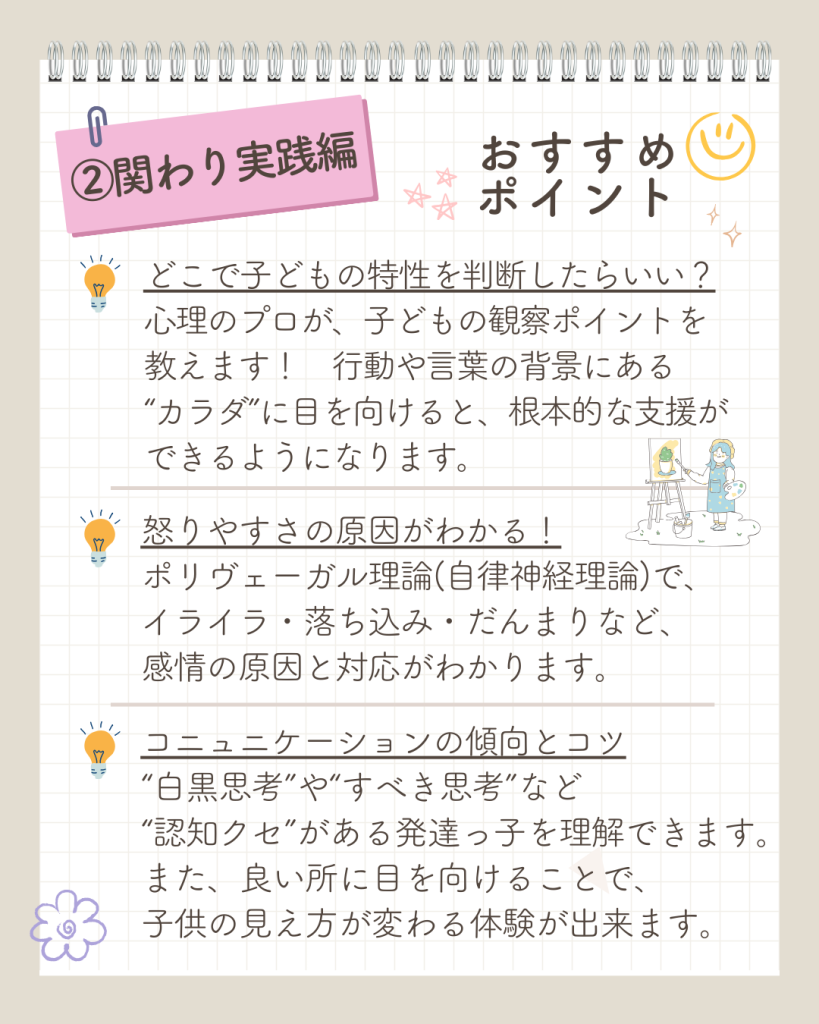 この回では、ポリヴェーガル理論や感覚特性の考え方をもとに、子どもの行動を“問題”ではなく“サイン”として読み取る視点を育てます。